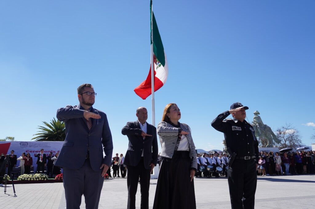 NICOLÁS ROMERO.- Al encabezar la ceremonia conmemorativa del Día de la Bandera, la alcaldesa, Yoselin Mendoza, aseguró que el hecho de que el gobierno de acción que transforma sea reconocido por el manejo transparente de sus recursos, es una bandera contundente y franca, porque opera contra uno de los mayores males del país: la corrupción.