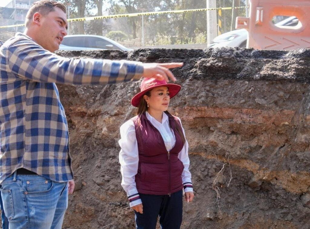 Durante su visita a Cahuacán, la Presidenta Municipal atestiguó los trabajos que se realizan a la altura del kilómetro 18 de la carretera Tlalnepantla-Villa del Carbón, donde el pasado mes de agosto ocurrió un deslave.