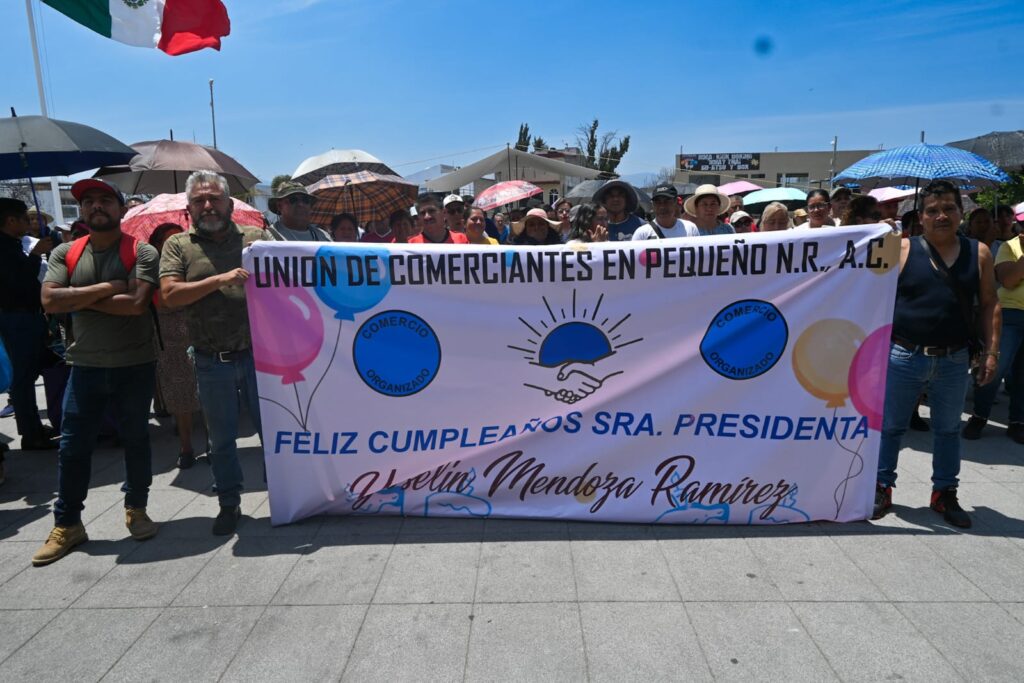 Hoy se vivió una manifestación diferente en la explanada del palacio municipal de Nicolás Romero, ya que más de 200 agremiados de la Unión de Comerciantes en Pequeño N.R. A.C., se reunieron para felicitar a la alcaldesa, Yoselin Mendoza, por su cumpleaños y manifestarle su agradecimiento por el apoyo que han recibido.